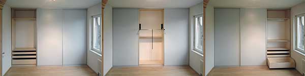 gerollten Sperrholzfüllungen. Dahinter unabhängige Schrankkorpusse mit