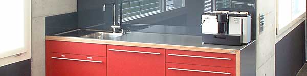 mit sichtbaren Multiplex-Kanten, Rückwand beschichtetes Glas.