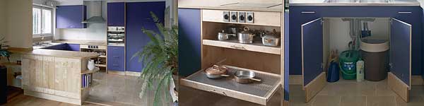 Fronten Linoleum und Birke massiv mit Anfassleisten, Abdeckungen: Theke