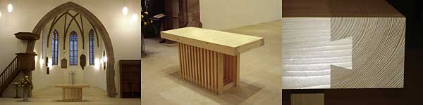 Tischblatt aus rohen Fichtenbalken. Die querlaufenden Füllungsteile sind mit