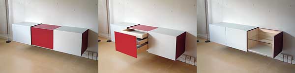 Aluminium-Verbundplatten. Mittelteil mit Frontauszug und zwei Innenschubladen.