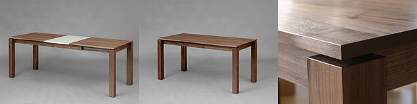 Dieser einfache Tisch besteht aus Schwarznuss. Die zwei Einlagen verlängern